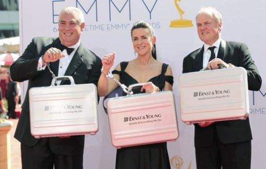 Ernst & Young accountants hold up cases containing the winning results before the 64th Primetime Emmy Awards in Los Angeles, September 23, 2012.