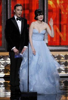 Presenters Jim Parsons (L) and Zooey Deschanel take the stage to hand out the award for outstanding writing in a comedy series at the 64th Primetime Emmy Awards in Los Angeles, September 23, 2012.