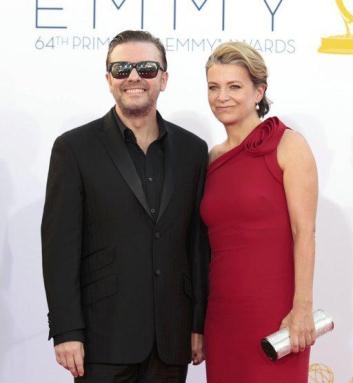 British actor Ricky Gervais and his partner Jane Fallon arrive at the 64th Primetime Emmy Awards in Los Angeles September 23, 2012.