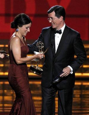 Julia Louis-Dreyfus accepts the award for outstanding lead actress in a comedy series for her role in "Veep" from presenter Stephen Colbert at the 64th Primetime Emmy Awards in Los Angeles, September 23, 2012.