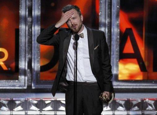 Aaron Paul accepts the award for outstanding supporting actor for a drama series for his role in "Breaking Bad" at the 64th Primetime Emmy Awards in Los Angeles, September 23, 2012.