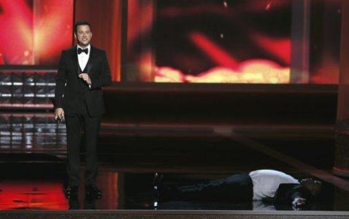 Tracey Morgan lies onstage, pretending to have passed out, as host Jimmy Kimmel stages a Facebook and Twitter stunt at the 64th Primetime Emmy Awards in Los Angeles, September 23, 2012.