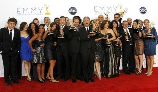 Jon Stewart and writers and producers of "The Daily Show With Jon Stewart" hold up their Emmy awards for outstanding variety series at the 64th Primetime Emmy Awards in Los Angeles September 23, 2012.