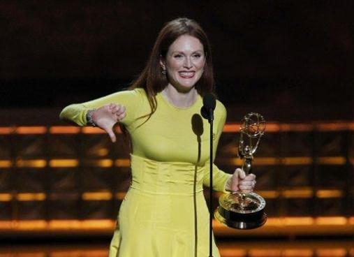 Julianne Moore gives a thumbs down sign after winning the award for outstanding lead actress in a miniseries or movie for "Game Change" at the 64th Primetime Emmy Awards in Los Angeles, September 23, 2012. The gesture was in reference to Sarah Palin's opinion of the performance.