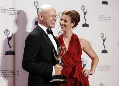 Julian Fellowes, creator of Downtown Abbey, and wife Emma arrive at the 64th Primetime Emmy Awards in Los Angeles, September 23, 2012.