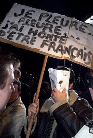 A masked man holds a sign reading "I cry, I cry, I'm ashamed of being French" after early results of the first round of the presidential elections in Paris,