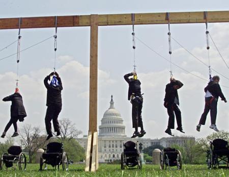 With the Capitol in the background, paraplegics from the Lives in the Balance group "hang" around Thursday, April 18, 2002 during a demonstration