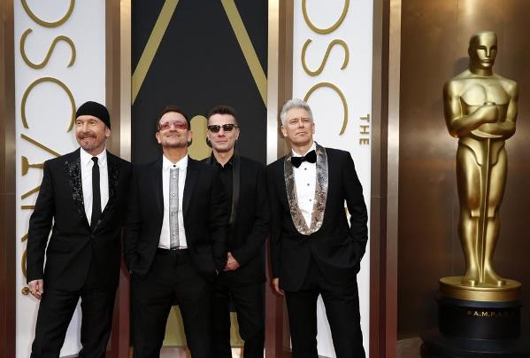 The Edge, Bono, Larry Mullen Jr. and Adam Clayton (L-R) of the band U2 arrive at the 86th Academy Awards in Hollywood, California March 2, 2014.
