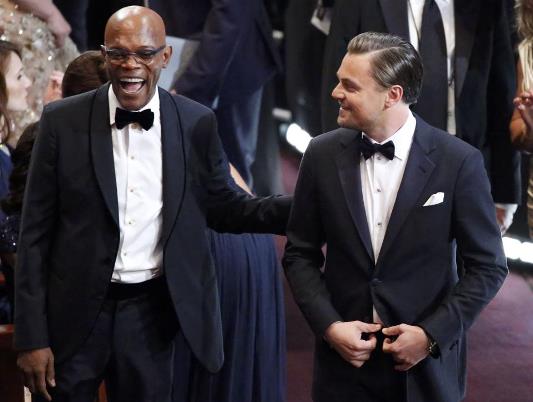 Actor Samuel L. Jackson (L) and best actor nominee Leonardo DiCaprio chat before the show at the 86th Academy Awards in Hollywood, California March 2, 2014.