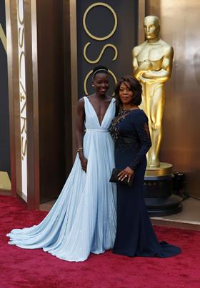 Lupita Nyong'o, best supporting actress nominee for her role in "12 Years a Slave," wearing a Fred Leighton headband and Prada gown, arrives with actress Alfre Woodard (R) at the 86th Academy Awards in Hollywood, California March 2, 2014.