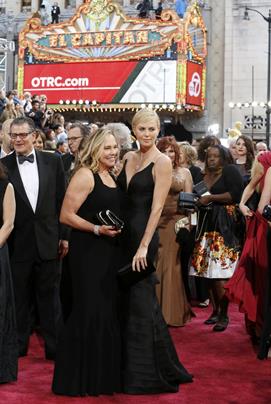 Actress Charlize Theron and her mother Gerda Jacoba Aletta Maritz (L) arrive at the 86th Academy Awards in Hollywood, California March 2, 2014.