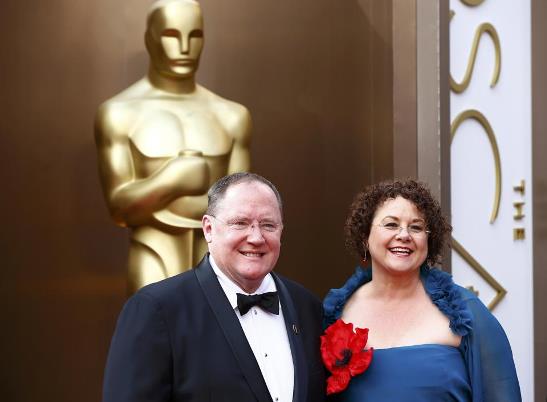 John Lasseter, Chief Creative Officer of Pixar and Walt Disney Animation Studios, arrives with his wife Nancy at the 86th Academy Awards in Hollywood, California March 2, 2014.