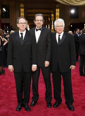 Producers Albert Berger (L) and Ron Yerxa (R) pose with screenwriter Bob Nelson from the film "Nebraska" arrive at the 86th Academy Awards in Hollywood, California March 2, 2014.