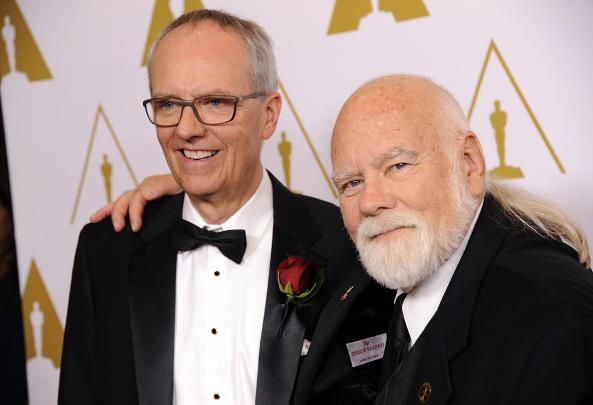 Post-production and distribution executive Charles "Tad" Marburg, left, recipient of the John A. Bonner Medal of Commendation, and visual effects supervisor and director of photography Peter W. Anderson, recipient of the Gordon E. Sawyer Award, pose together before the Academy of Motion Picture Arts and Sciences' annual Scientific and Technical Awards on Saturday, Feb. 15, 2014, in Beverly Hills, Calif.