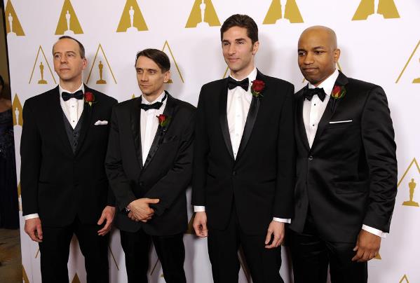 Left to right, Robert Lanciault, Andre Gauthier, Benoit Sevigny and Yves Boudreault, designers of the FILMBOX software application and recipients of a Scientific and Engineering Award, pose together at the Academy of Motion Picture Arts and Sciences' annual Scientific and Technical Awards on Saturday, Feb. 15, 2014, in Beverly Hills, Calif.