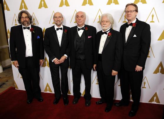 Left to right, Lou Levinson, David Reisner, Joshua Pines, Curtis Clark, ASC, and David Register, developers of the American Society of Cinematographers' Color Decision List technology and recipients of a Technical Achievement Award, pose together at the Academy of Motion Picture Arts and Sciences' annual Scientific and Technical Awards on Saturday, Feb. 15, 2014, in Beverly Hills, Calif.
