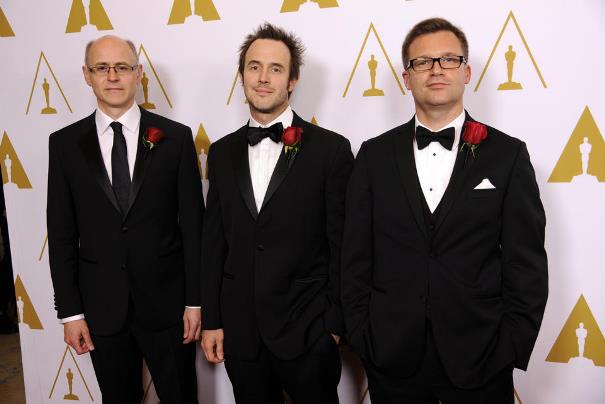 Left to right, Dan Piponi, Olivier Maury and Ian Sachs, creators of the ILM Plume system that simulates and renders fire, smoke and explosions for motion picture visual effects and recipients of a Technical Achievement Award, pose together at the Academy of Motion Picture Arts and Sciences' annual Scientific and Technical Awards on Saturday, Feb. 15, 2014, in Beverly Hills, Calif.