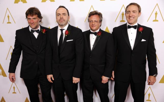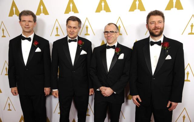 Left to right, Tibor Madjar, Csaba Kohegyi, Andre Camenisch and David Cardwell, responsible for the design and implementation of Mudbox software and recipients of a Technical Achievement Award, pose together at the Academy of Motion Picture Arts and Sciences' annual Scientific and Technical Awards on Saturday, Feb. 15, 2014, in Beverly Hills, Calif.