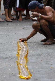 A man lights a firecracker called "Judas Belt" to celebrate New Year festivities in Baclaran town, Paranaque city, metro Manila December 31,2010. Philippines' Department of Health said in a report released Tuesday it has launched an all-out war against the sale of fireworks due to injuries. Since December 28, a total of 173 fireworks-related injuries have been reported, of which, 48 percent were caused by Judas Belt.