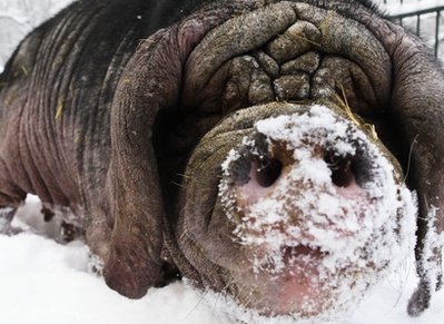 A Meishan pig digs in the snow at the Tierpark zoo in Berlin, Thursday, Dec. 30, 2010. The Tierpark presents a Meishan pig as the good luck pig for the new year 2011. In Germany the pig is a traditional symbol for good luck at the beginning of a new year.