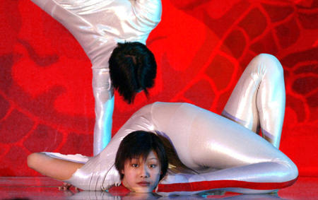 A Chinese acrobat contorts her body during a performance in the southern city of Guangzhou January 10, 2002.
