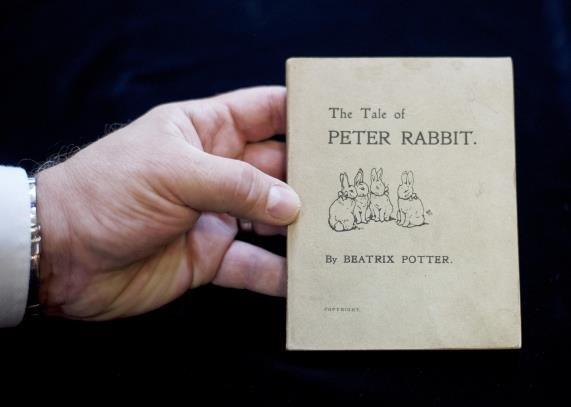 A member of staff holds a first issue of The Tale of Peter Rabbit, estimated at £25,000-35,000, which will be auctioned in the Beatrix Potter Books and Works on Paper sale on her 150th anniversary, at an auction house in London, Wednesday, July 27, 2016.