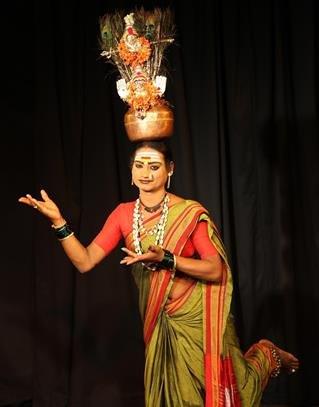 An Indian transgender K Manjamma Jogathi carries a vessel with images of Hindu goddess Renuka or Yellamma, her patron goddess, as she poses for a portrait after performing at International Trans Art Festival in Bangalore, India, July 29, 2016. The community of transgender artists known as Jogathis from southern Indian state of Karnataka perform at festivals and various other occasions to earn their livelihood.