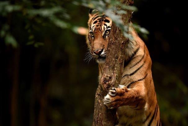 A Sumatran Tiger called Indrah climbs a tree in its enclosure at the Melbourne Zoo in Melbourne, Australia, July 29, 2016. Only around 350 Sumatran Tigers remain in the wild due to deforestation. International Tiger Day is celebrated on July 29 to raise awareness of endangered tiger species.