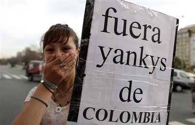 A girls gestures while holding a banner that reads in Spanish: 'Yankees get out of Colombia' during a protest against Colombia's plan to give U.S. troops greater access to its military bases in Buenos Aires, Friday, Aug. 28, 2009.
