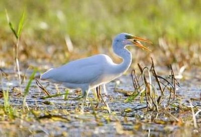 A great egret feeds at a lake near the village of Karpavichi, some 60 kilometers (38 miles) northwest of Minsk, August 28, 2009.