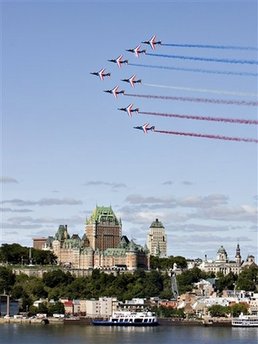 The French aerobatic team, Patrouille de France, flies over Quebec City, Canada, Friday Aug. 28, 2009 as they practice for a show marking the 75th anniversary of the French Air Force, on Saturday Aug. 29, 2009 during a stop over. The Patrouille de France is on its way to Brazil.