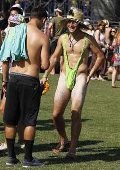 A concert attendee wears a swimsuit as he arrives at the main stage area during the 2nd day of the Coachella Valley Music & Arts Festival in Indio, California April 16, 2011.
