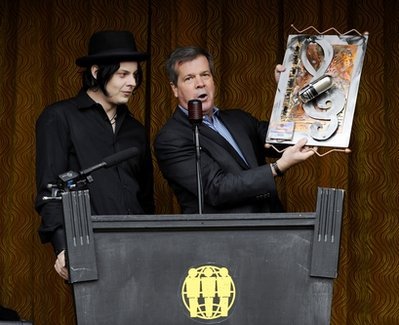 Music artist Jack White, left, receives the first ever Music City Ambassador Award from Nashville Mayor Karl Dean, right, during a news conference at ThirdMan Records, Saturday, April 16, 2011, in Nashville, Tenn.