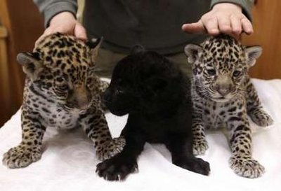 Employee Christina Kosorygina shows off three one-month-old jaguar cubs at the Leningrad city zoo in St. Petersburg, April 14, 2011. Black male jaguarRock and spotted female jaguar Agnessa gave birth to the three cubs on March 15, according to the zoo employees.