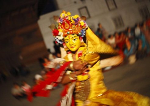 A medium in a trance performs a traditional mask dance during the Khadgha Siddhi festival in Kathmandu April 21, 2012. The festival, held once in twelve years, is marked with traditional mask performances performed in various places of Kathmandu throughout the year.