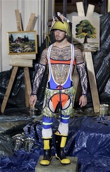 A Model displays a creation by German born designer Bernhard Willhelm as part of his men's Spring-Summer 2010 fashion collection in Paris, Saturday, June 27, 2009.