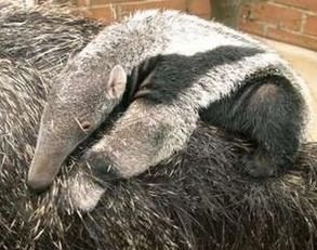 Baby giant anteater Alexandro clings to the back of his mother Chakira at an enclosure at Dormund zoo July 6, 2007. Alexandro was born at the zoo on July 3.