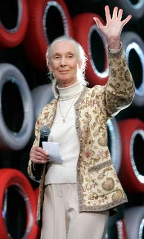 English anthropologist Jane Goodall waves as she takes the stage during the Live Earth New York concert in East Rutherford, New Jersey, July 7, 2007. Former U.S. vice president Al Gore and global partners are staging the Live Earth concerts held on seven continents simultaneously to raise awareness of environmental issues.