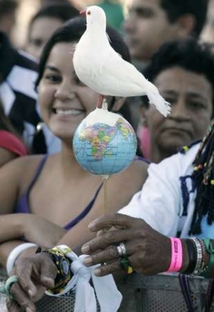 A member of the audience holds a globe of the world with a toy dove attached to it during Brazilian singer Xuxa Menegel's performance at the Live Earth concert on Copacabana beach in Rio de Janeiro, Brazil July 7, 2007. Former U.S. Vice President Al Gore and his global partners are staging the Live Earth concerts held on seven continents simultaneously to raise awareness of environmental issues.