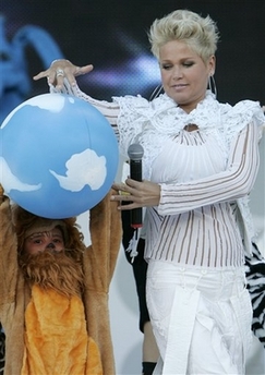 Brazil's singer Xuxa, right, performs during the Live Earth concert at the Copacabana beach in Rio de Janeiro, Saturday, July 7, 2007. A last-minute bid to shut down South America's Live Earth concert failed when a judge ruled against a prosecutor who argued that safety can't be guaranteed for an audience of 700,000 on Copacabana beach, Brazilian media reported Saturday.