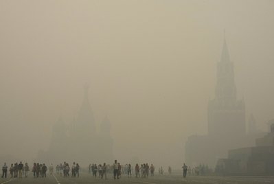 St. Basil's Cathedral, left, and the Kremlin, right, are seen as tourists walk through thick smog on the Red Square in Moscow, Russia, Friday, Aug. 6,2010. The city of Moscow was shrouded Friday by a dense smog that grounded flights at international airports and seeped into homes and offices, as wildfires that have killed 50 people nationwide continued to burn.