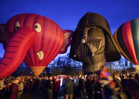 Hot air balloons, shaped like the Nelly-B and Darth Vader characters, are displayed during a night glow on the evening of Day 3 of the Canadian Hot Air Balloon Championships in High River September 27, 2013. Spectators had the opportunity to walk among the balloons which do not actually launch. The launches during the day will determine qualifiers for the World Hot Air Balloon Championships in Sao Paulo in 2014.