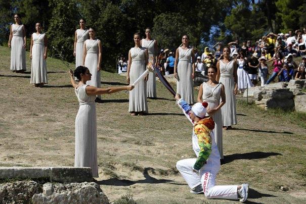 Greek actress Ino Menegaki, playing the role of High Priestess, passes the Olympic flame to Greek skier Yannis Antoniou, the first torchbearer of the torch relay, during a dress rehearsal for the torch lighting ceremony of the Sochi 2014 Winter Olympic Games at the site of ancient Olympia in Greece September 28, 2013. The official lighting ceremony for the Sochi Games will take place on September 29.