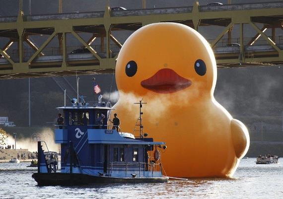 A 40-foot-high (12-metre-high) and 30-foot-wide (nine-metre-wide) inflatable rubber duck, created by Dutch artist Florentijn Hofman, is towed up the Allegheny River in Pittsburgh, Pennsylvania September 27, 2013. The event marks the North American debut of Hofman's Rubber Duck Project, which has taken place in other cities in Asia, Europe, Australia and South America.