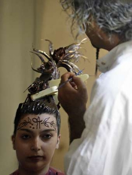 Seen in the reflection of a mirror artist Angelo Pidala (R) creates a chocolate hairdo on Veronica Caciagli at the Eurochocolate festival in Perugia, Italy October 14, 2006. The 13th annual public festival, hosted by the chocolate industry, runs until October 22.