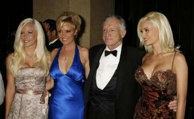 Playboy magazine founder Hugh Hefner and his three live-in girlfriends (L-R) Kendra Wilkinson Bridget Marquardt, and Holly Madison arrive at the American Cinematheque annual benefit gala in Beverly Hills, California October 13, 2006. Actor George Clooney will receive the 21st American Cinematheque Award at the gala.