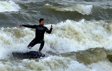 James Moya of Elyria, Ohio, catches some waves on Lake Erie in Cleveland, Saturday, Oct. 14, 2006. Heavy winds the last few days have brought unusually good surfing to parts of the south shore of Lake Erie.