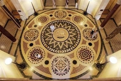 People walk across the floor of the rotunda of Los Angeles City Hall, Wednesday, Jan. 2, 2008. Since its completion in the late 1920s, City Hall's exterior and interiors have been the scene of hundreds of movies and television shows. Its classic design stands in for venues far and wide, and for a price the studios love: free.