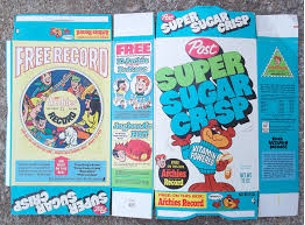 Photos: RCA record cover | I don't think the records embossed on the back panel of Post cereal products counted toward the Billboard chart numbers. Come to think on it, Sugar Bear once had his own cartoon show but the FTC stepped in and ruled it was a 30 minute long commercial and wasn't allowed on TV any longer