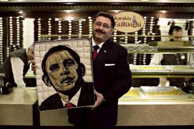 Dessert specialist Nadir Gullu holds a pan with a baklava made into the iconic image of U.S. President Barack Obama, dubbed "the Baracklava,"at Gulluoglu baklava bakery in Istanbul, April 6, 2009. Gullu spent five days and used 40 layers of pastry to make the baklava in honour of Obama's visit to Istanbul on Monday and Tuesday. Obama reiterated on Monday his support for Turkey's bid to join the European Union despite opposition from member states, but urged the mainly Muslim country to speed up long-stalled reforms.